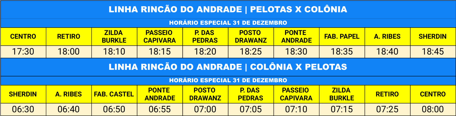 Nos dias 31/12 e 02/01 serão realizados horários especiais: